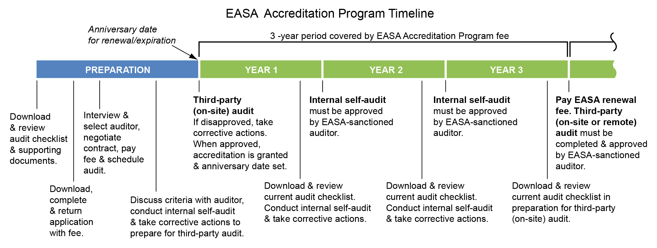 At the end of the third year, the cycle begins again with the payment of the non-refundable EASA renewal fee ($300 for EASA members, $1500 for non-members) and the successful completion of a third-party (on-site or remote*) audit.