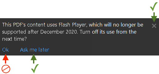 Additionally, you may be shown the popup below. If you see this popup, DO NOT CLICK "Ok" as this will disable Adobe Flash Player the next time this PDF is opened. Instead, click the "X" or "Ask me later". If "Ok" is clicked, repeat steps 1 - 4 above to re-enable Adobe Flash.