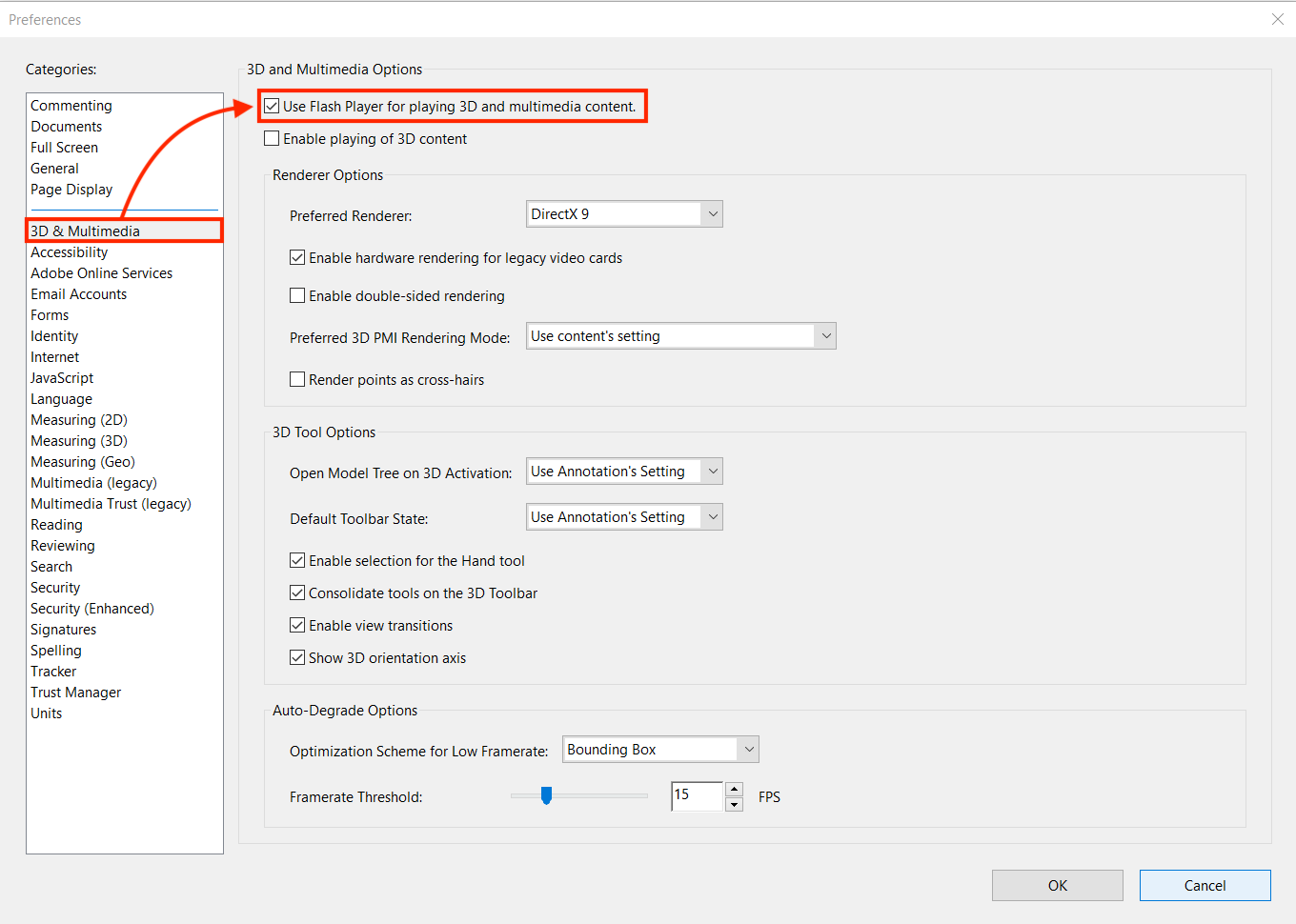 Newer versions of Adobe Reader now have Adobe Flash multimedia playback disabled by default. Follow these steps to enable Adobe Flash.