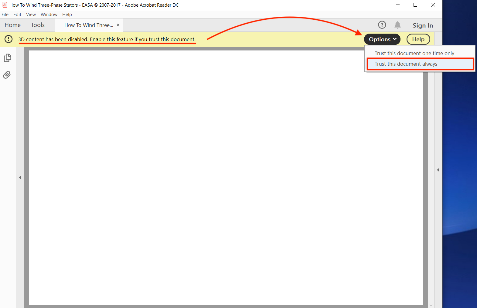 NOTE: Some users' systems are set up to open PDFs within a web browser. Our software will not work if it is opened within a web browser. If this is happening, start up Adobe Reader (or Adobe Acrobat) and go to FILE > OPEN and select the PDF file containing How to Wind Three-Phase Stators.