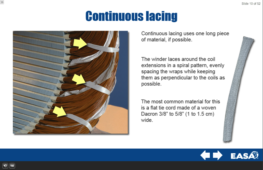 Lesson 10: Lacing and Bracing of Windings The inserted winding coils should be snug in the slots, but will need reinforcement to reduce the tendency to move or shift. Varnish treatment and curing will do much to make the winding more rigid; however, there is another key step to be used to reinforce winding coils. That is Lacing and Bracing of Windings, with the main objectives being to make the winder proficient in the methods, materials and procedures for lacing and bracing of windings. The student will also learn how to determine the amount and type of bracing to use on different windings.