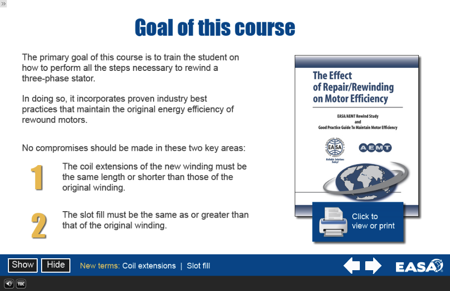 Self-paced, interactive training for stators 600 volts or less
