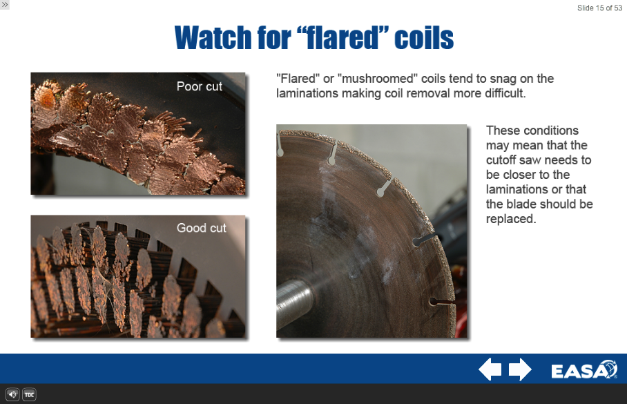 Lesson 3: Coil Cutoff The critical objective of the Coil Cutoff lesson is to be able to cut off coil extensions without injury to the technician or the stator. Essentially the idea is to cut the copper wire, not any other metal part of the stator, and to do it in a manner that does not harm the stator or the person performing the task. Proper cutting of the coil extensions also reduces time and effort when pulling the coils out.