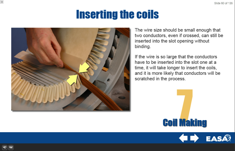 Lesson 8: Winding Insulation and Coil Insertion Having made new coils, they need to be inserted into the core, bringing up the next step, Winding Insulation and Coil Insertion. The objectives of this lesson are to be able to determine the materials and tools needed; and how to install random-wound coils into a three-phase stator core. There are actually multiple steps in this process, dealing with insulating and inserting. The slots are insulated, then coils inserted, followed by insulating between coils. The student will also learn how to recognize a properly inserted set of coils.